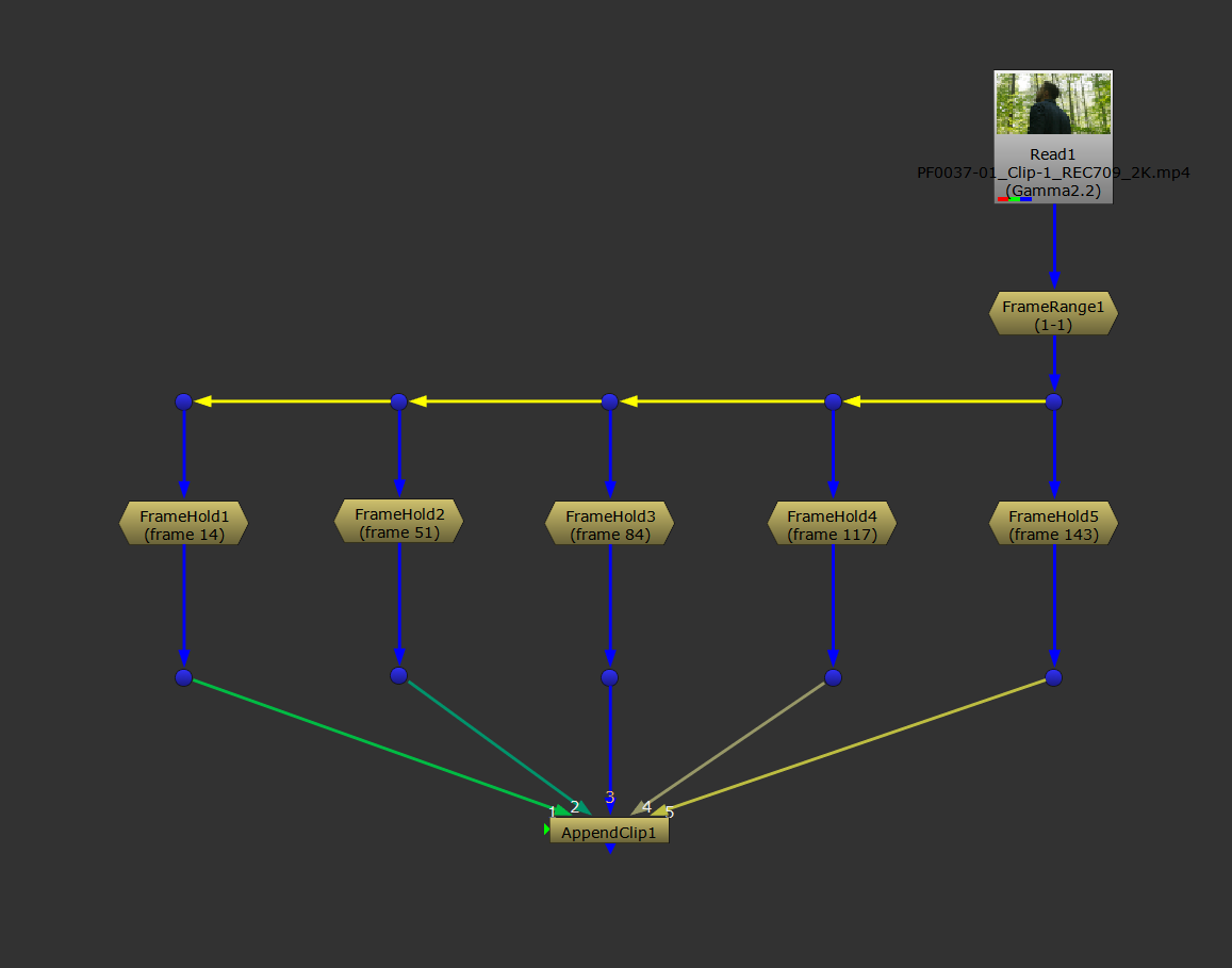 Now, we can connect up all of the FrameHolds with an AppendClip node (no need to change any of the default settings in the AppendClip), and create a new image sequence.