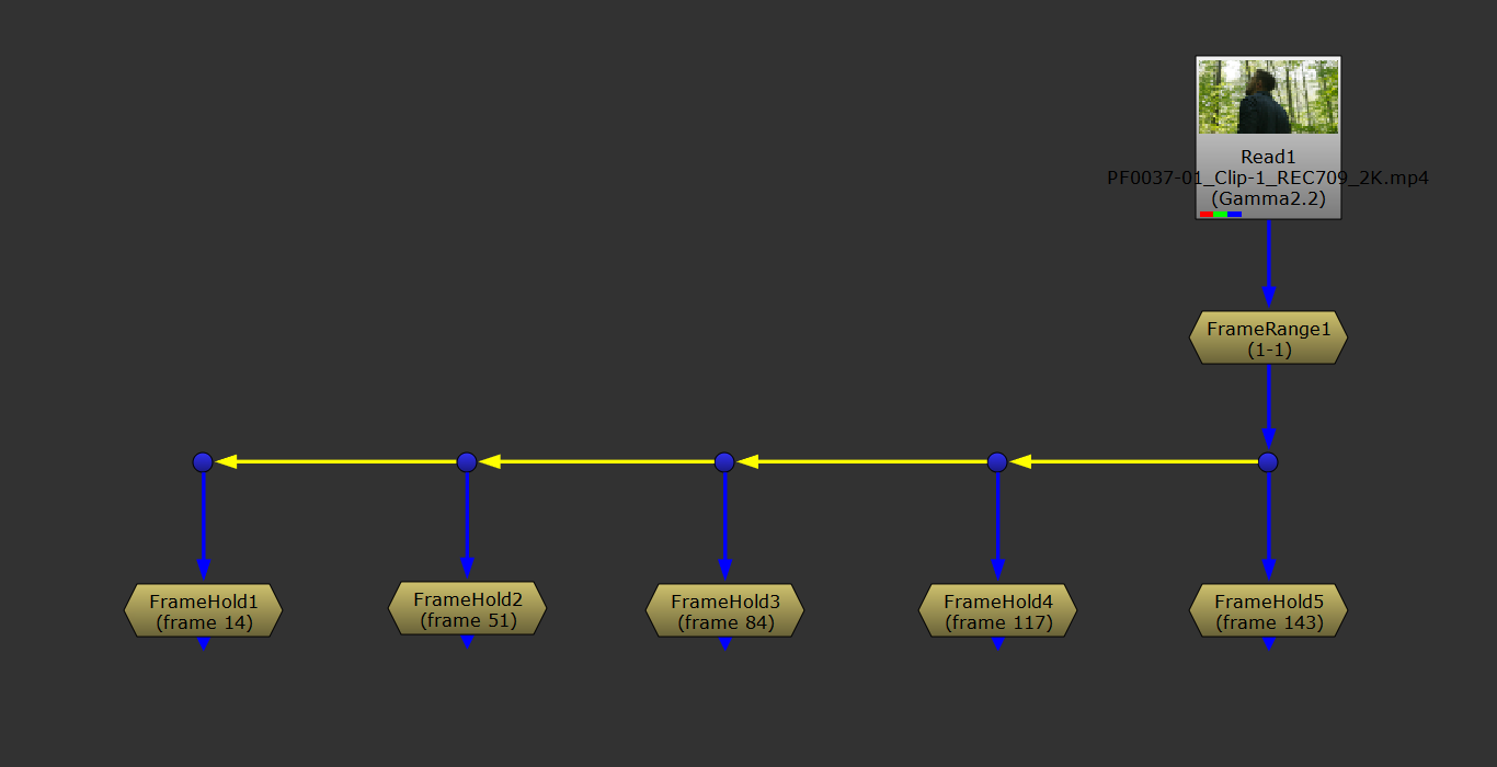 Changing the frame range of each FrameHold to a single frame by using a FrameRange node set to 1-1.