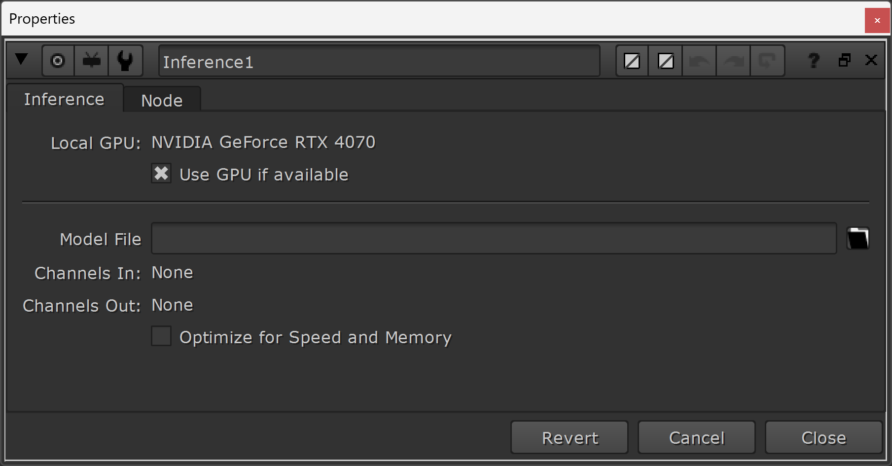 Below the Model File field, you'll also see the input and output channels, so that you can quickly check that the Inference node is processing and outputting what you expect.