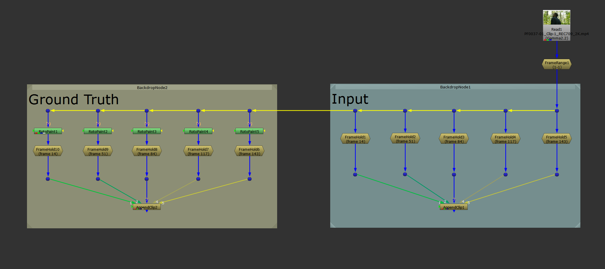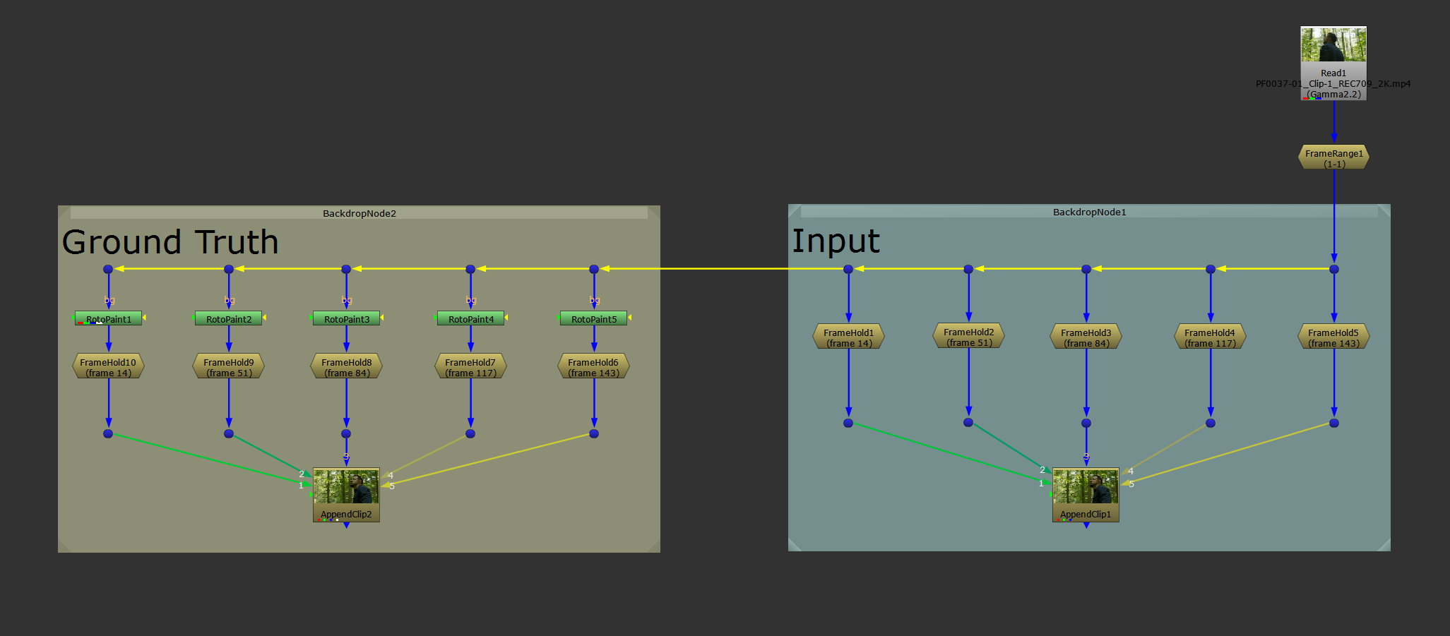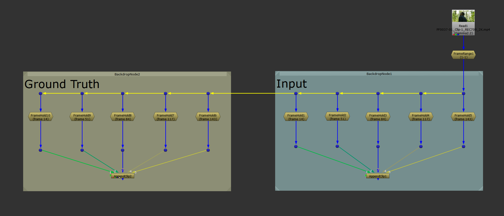 It’s extremely important that the same FrameHolds on both sides are connected up to their respective AppendClip node in the exact same order. The two image sequences have to match each other perfectly, otherwise CopyCat will be comparing the wrong images, and you'll get errors in your training.