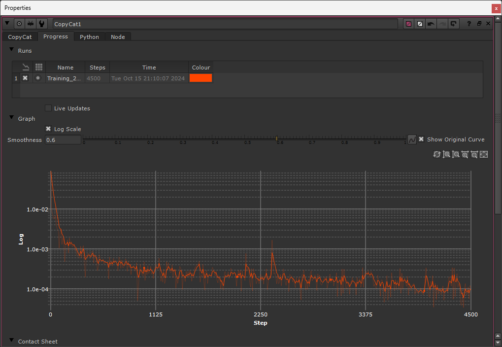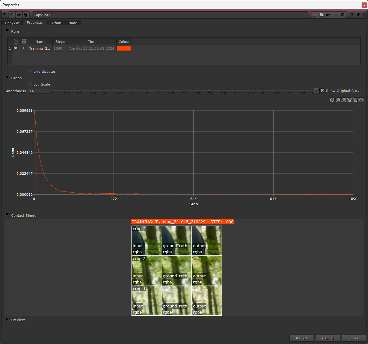 If the Loss/Steps graph is trending upwards, i.e. more errors are introduced, or starts plateauing early at a high Loss value, it could be because the AppendClip nodes are not connected up to the Input and GroundTruth images in the exact same order, or that your selected Model Size and/or Crop Size isn’t large enough.