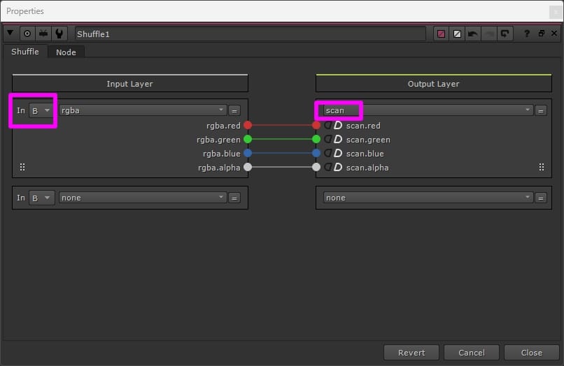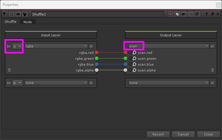 Shuffling the original RGBA channels from the A-input into the “scan” layer.