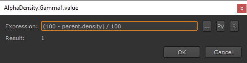 A value of 100 in the density slider becomes a value of 0 in the Gamma1 node. A value of 0 in the density slider becomes a value of 1 in the Gamma1 node.