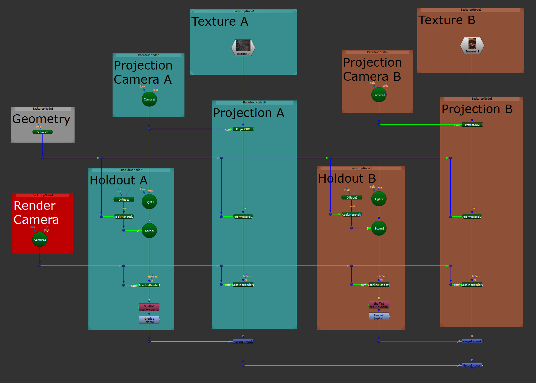 First, project your texture A onto your geometry using your projection camera A. (This is a completely standard projection using a Project3D node).