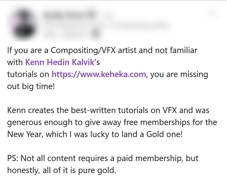 All of the tutorials are made by a Compositing Supervisor actively working in the VFX industry, with 12+ years of professional experience and contributions to multiple Oscar, Emmy, BAFTA, and VES awards and nominations.