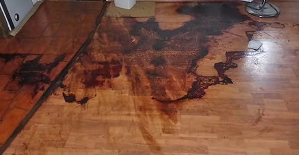 (1) A fresh bloodstain: the blood is bright red. (2) A somewhat aged bloodstain: the blood is still red, but turning darker. (3) An aged bloodstain: the blood has turned brown in colour. (4) An even more aged bloodstain: the blood has turned black in colour.