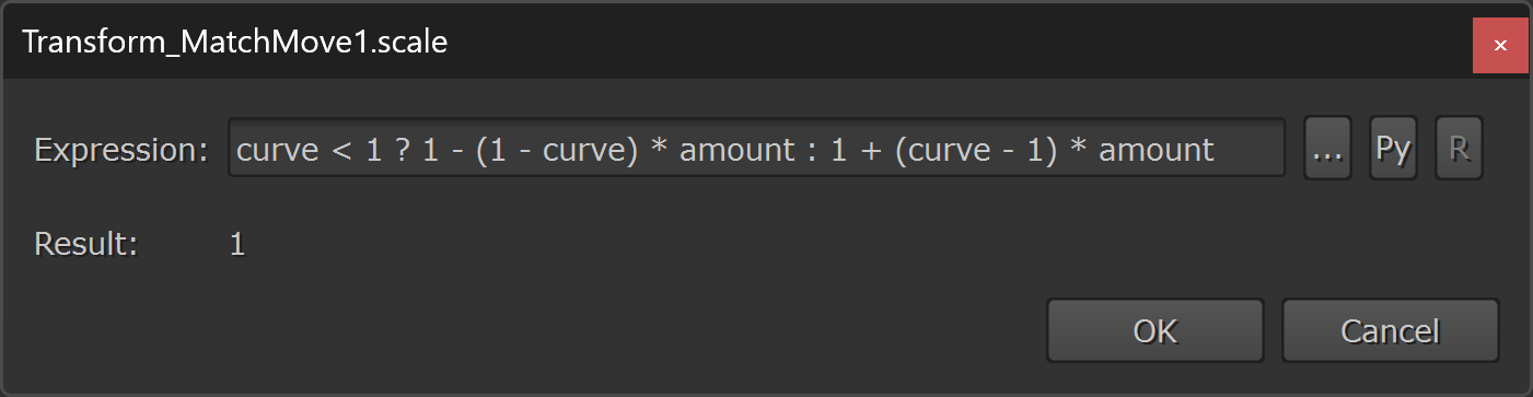 Next, to scale the baked animation curve of the scale knob – which has a default value of 1 (as opposed to a default value of 0 for the translation and rotation knobs) – we have to make a little bit more advanced expression.