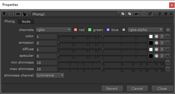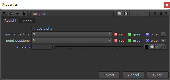 Next, connect the material input of the ReLight node to a Phong node, with the following settings: