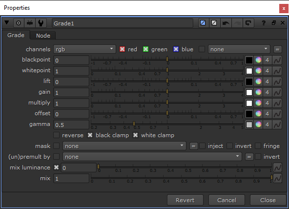 Finally, to be able to adjust the matte, add a Grade node, also masked by the alpha of the CG. A good starting point is to set the gamma to 0.5, which will darken the matte where the surfaces are facing directly towards the camera. Adjust the gamma and gain as needed. Make sure to clamp the black and white levels by ticking the checkboxes.