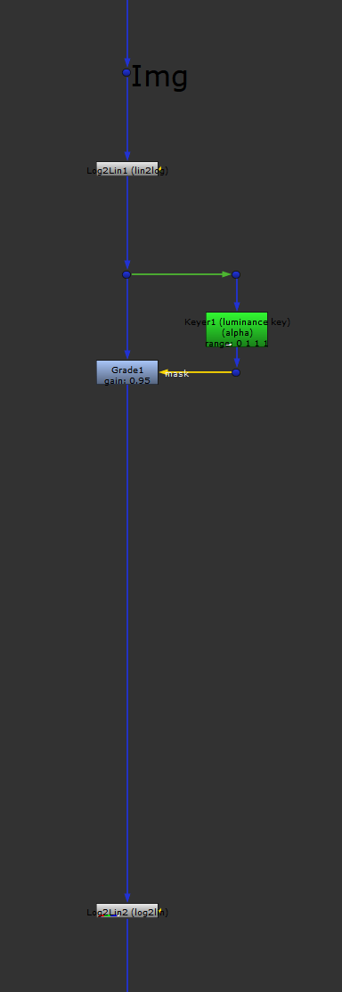 Add a Grade node and mask it by a Keyer node with the operation set to luminance key. Set the gain in the Grade node to 0.95 (we can adjust later as necessary). In the Keyer node, leave the default values as they are, i.e. A = 0 and B = 1. This little setup will slightly grade down the top-end values in the image but not affect the low-end values by much.