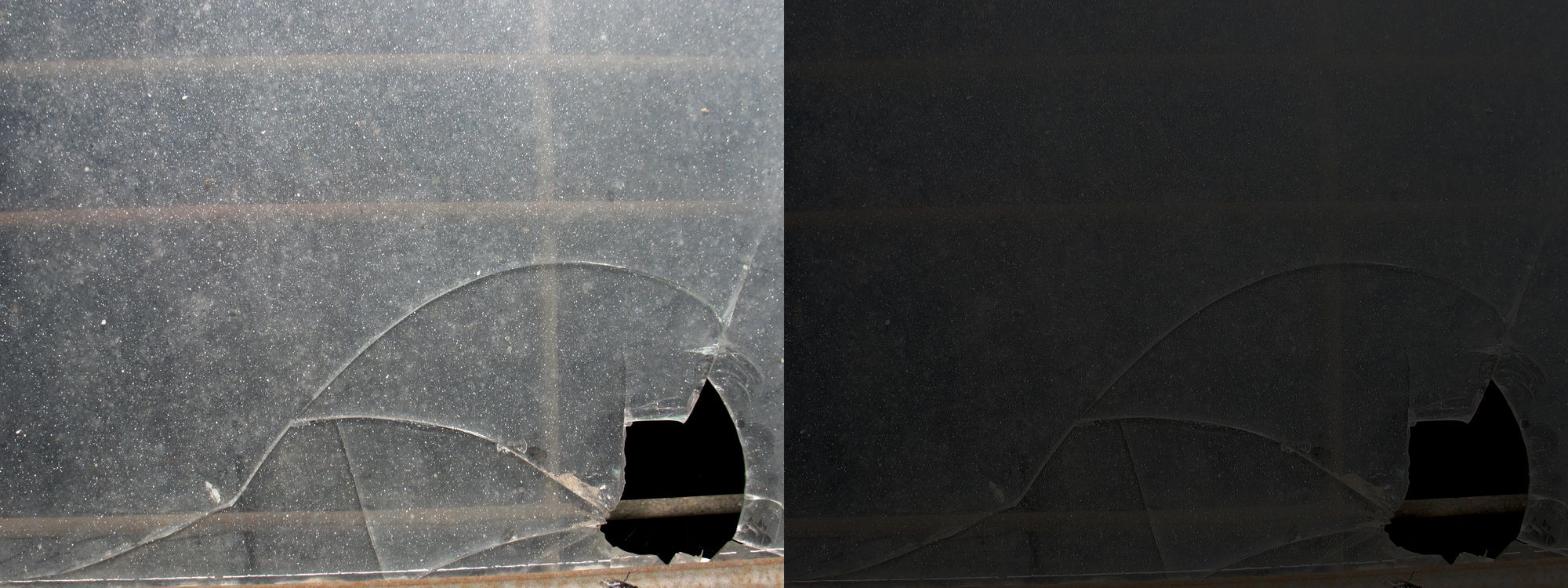 Grading down the image using a ColorCorrect node, tweaking the highlights and midtones. If you zoom in closer, there is a whole bunch of artifacting happening, especially on the cracks in the glass, but also on most of the small specks. The result is indeed flatter, but not all that much different to just grading down the whole image.