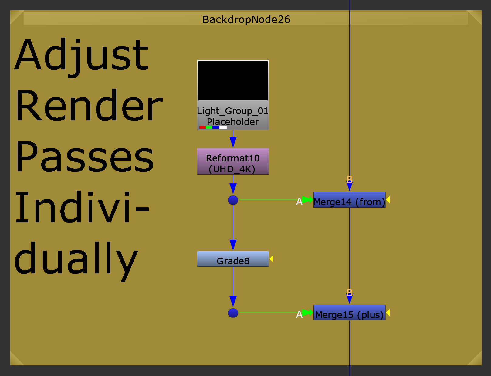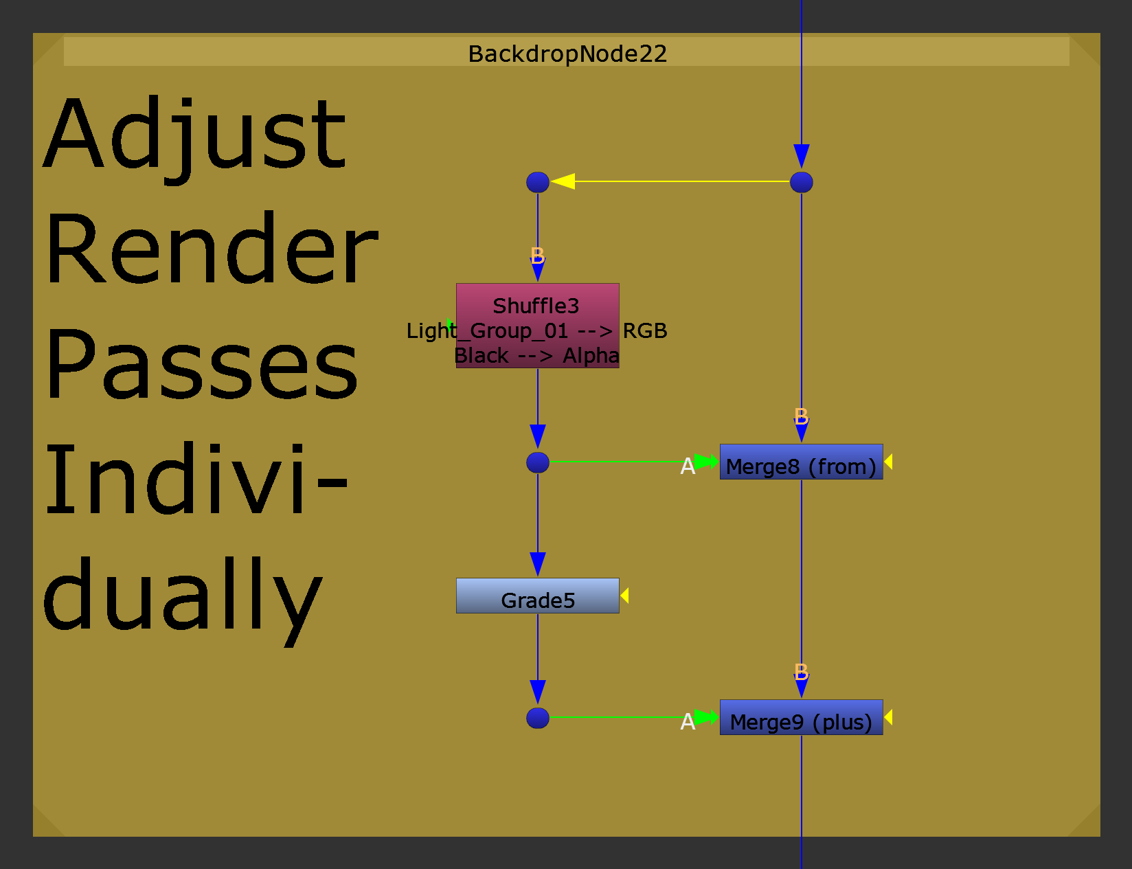 - Branching out again, grade the shuffled out render pass in a new pipe, and Merge (plus) the graded result (A) with the output of the Merge (from) node in the main pipe (B). Now, you will have reintroduced the contribution of the render pass to the beauty, including any changes you have made to the pass. You can change the colour of the render pass’ contribution, or make it brighter or darker. And you can even stencil out sections of it that don’t work too well.