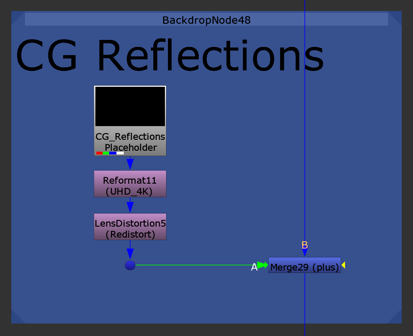 - Swap the A and B inputs in the Merge node in the Merge backdrop.