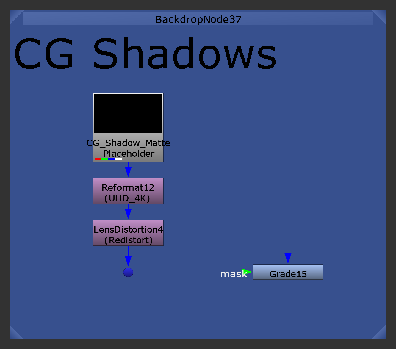 Again, make sure to to reformat and add lens distortion to the CG shadow matte render, and then use it as a mask for a Grade node to grade down the scan: