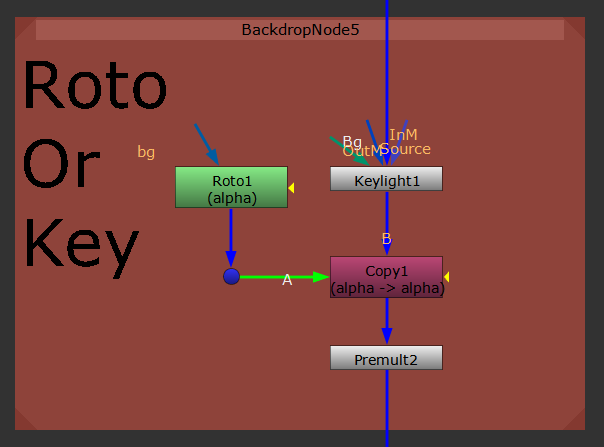 If you have roto available for the shot, you’d put that here in place of the Roto node. If not, either create your own rough roto or key depending on the shot, and copy the alpha (A) to the scan (B) using a Copy node, before premultiplying using a Premult node.