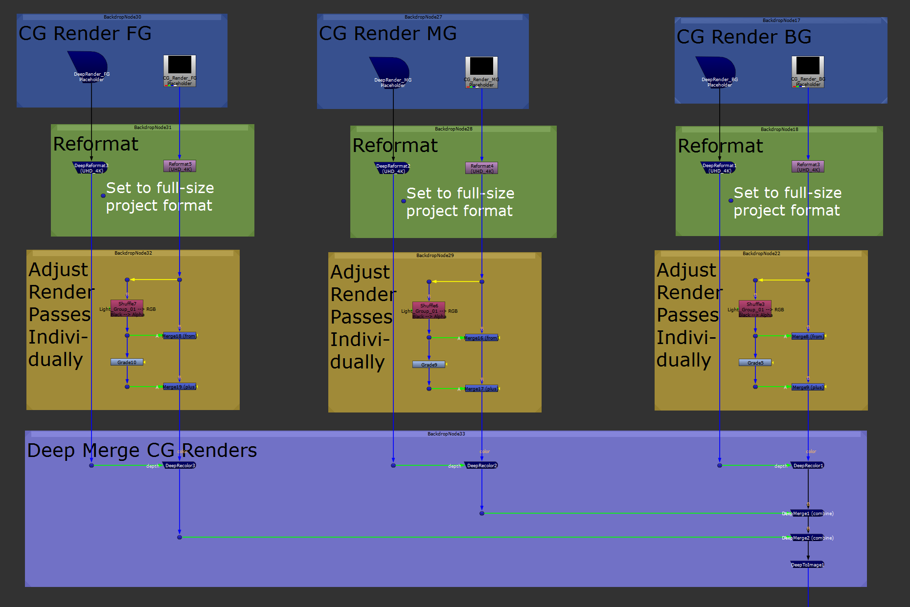 For each copy, change which render pass is being shuffled out in the Shuffle node and the adjustments made for it, and daisy chain the copy below the first one in the main pipe.