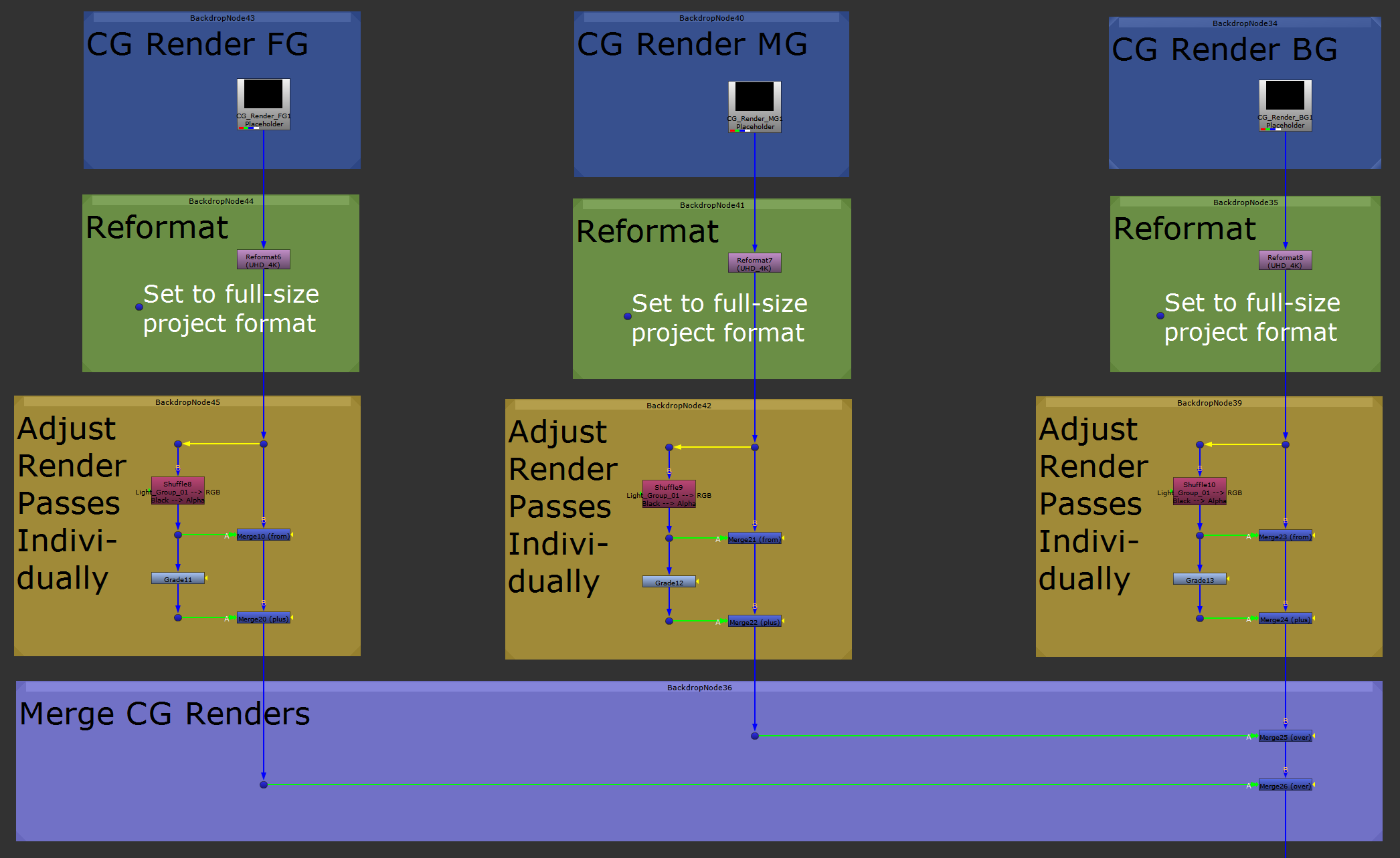If you have multiple CG renders, for example foreground, midground, and background, you would just copy everything above, swap in the other renders, and merge them all using Merge (over) nodes: