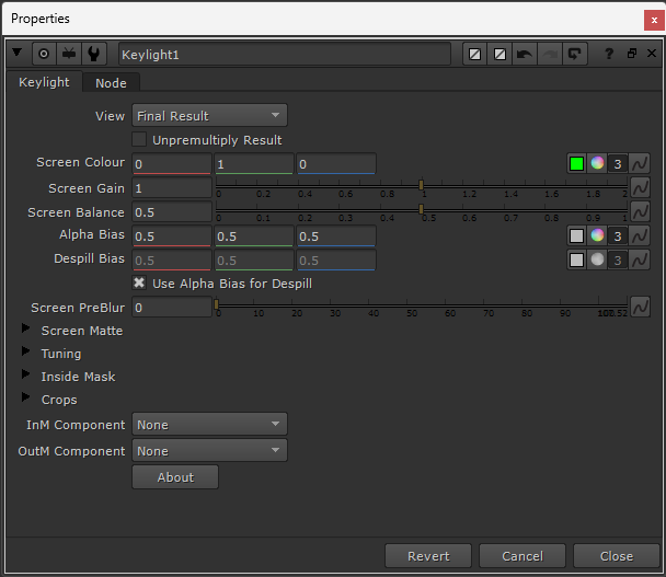 The Keylight settings for despilling: Only the Screen Colour has been changed from the default value, in this case the green value has been set to 1 (to despill the green spill).