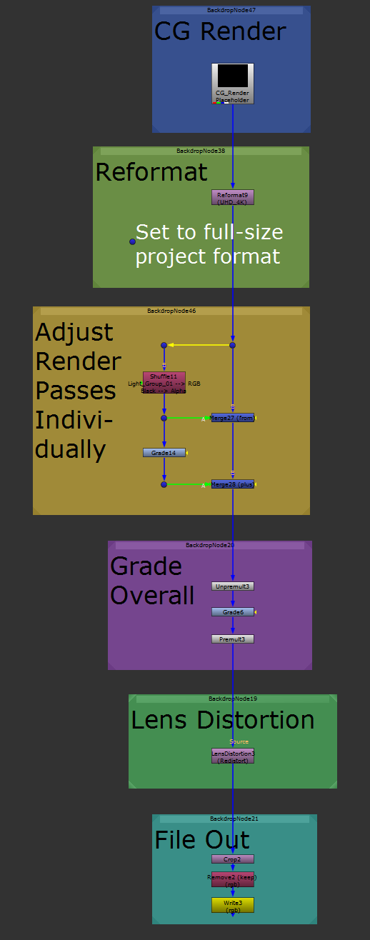 Once you've adjusted the render pass contributions to taste, you can do any overall grading adjustments to the CG.