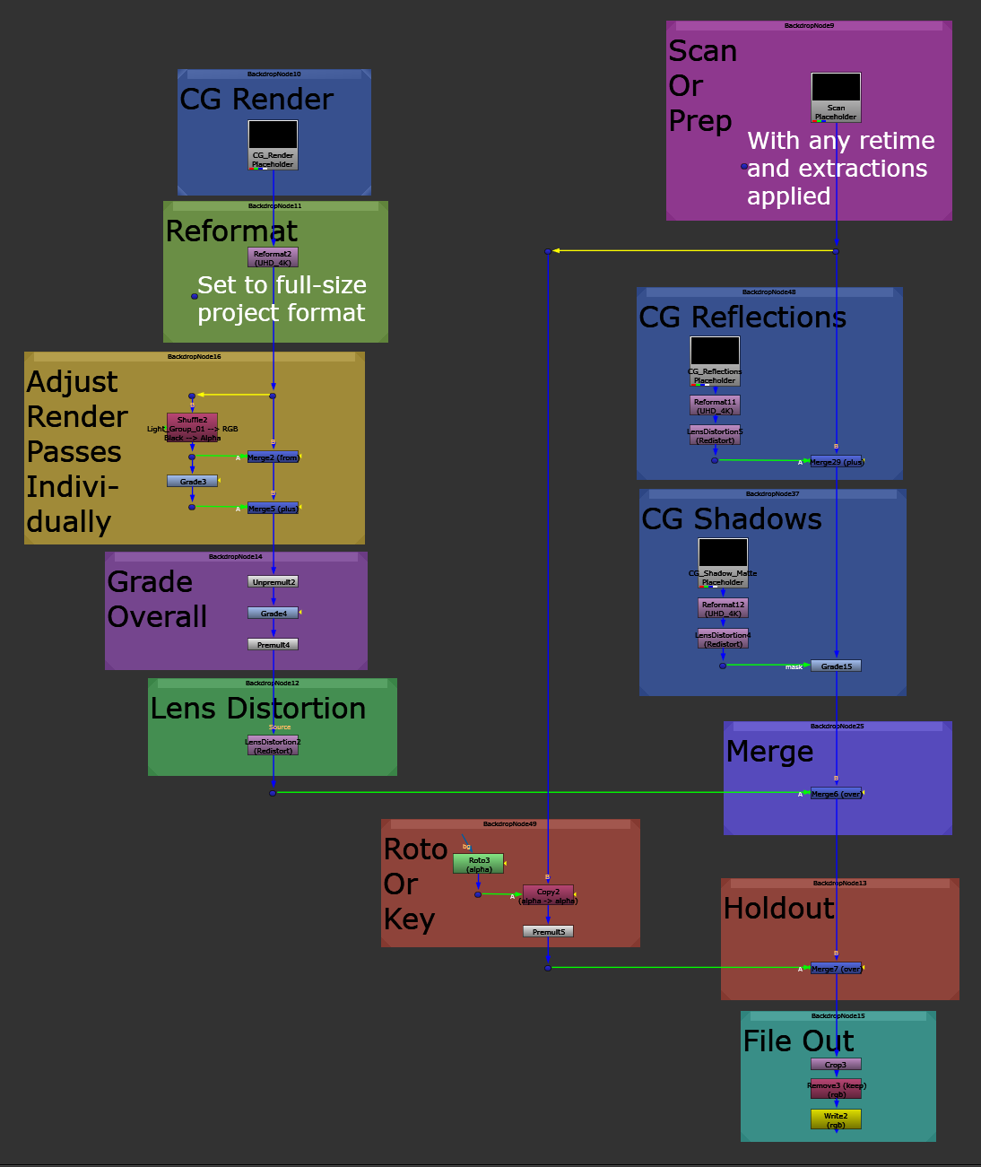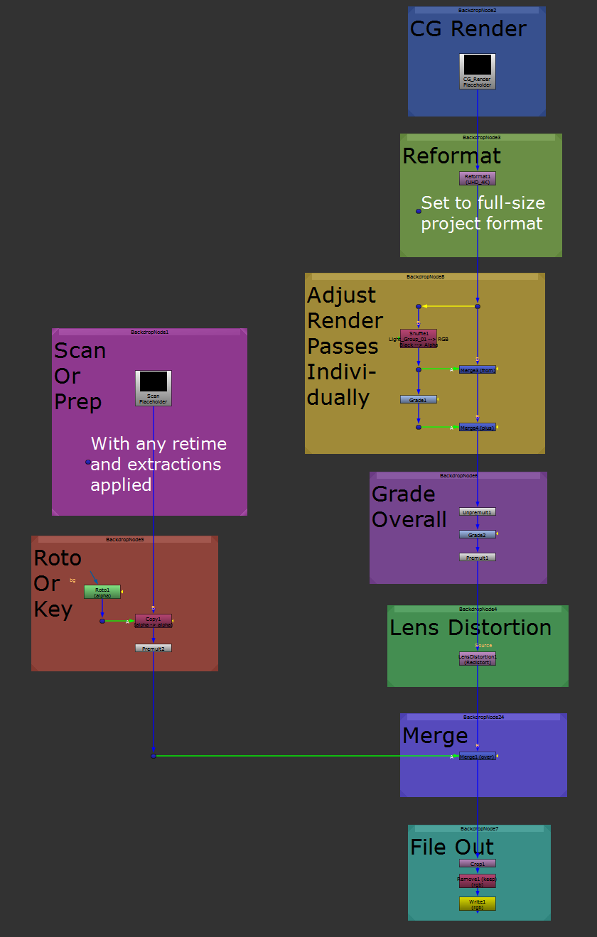 - Rearrange the Roto Or Key backdrop like in the picture above. If there are any foreground subjects or objects passing in front of the CG, you can roto/key them and put them back over the CG with a Merge (see the Holdout backdrop).