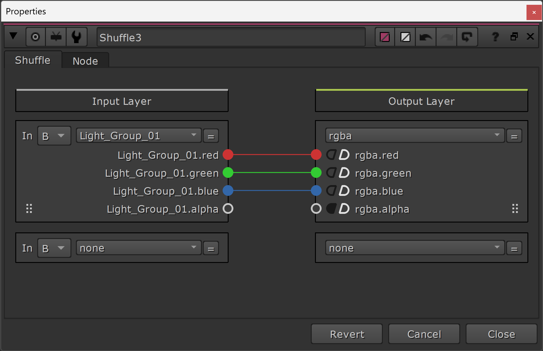 - Using a Shuffle node branched off from the main pipe, shuffle the render pass that you would like to adjust into the RGB channels. (In this example, Light_Group_01).