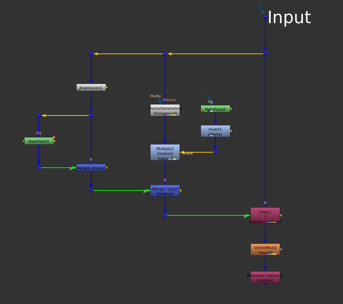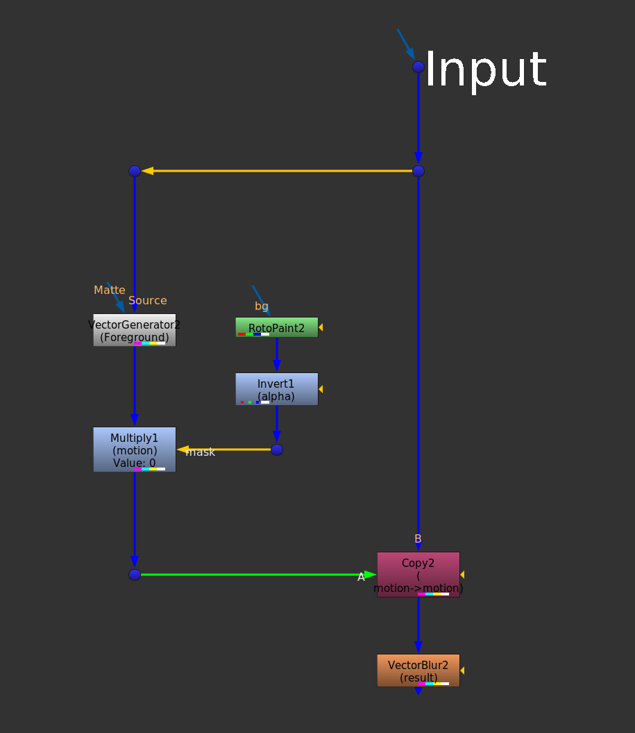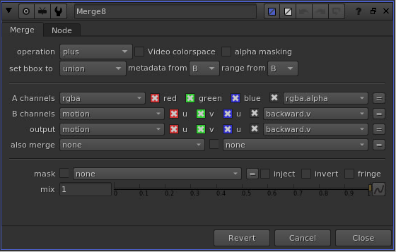 Here, I’m merging rgba from the A-input with motion from the B-input, and outputting motion.