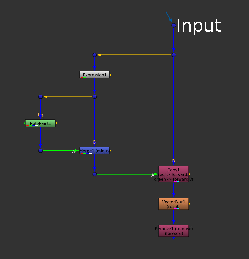 Copy the result of the Merge (minus) node into the B-pipe. I’ve used the red → forward.u and green → forward.v channels, but you can use any non-rgb channels.