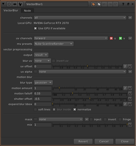 I used the same settings in the VectorBlur node as before, except for changing the uv channels to motion instead of forward. And finally, I tidied up the B-pipe by removing the motion layer.
