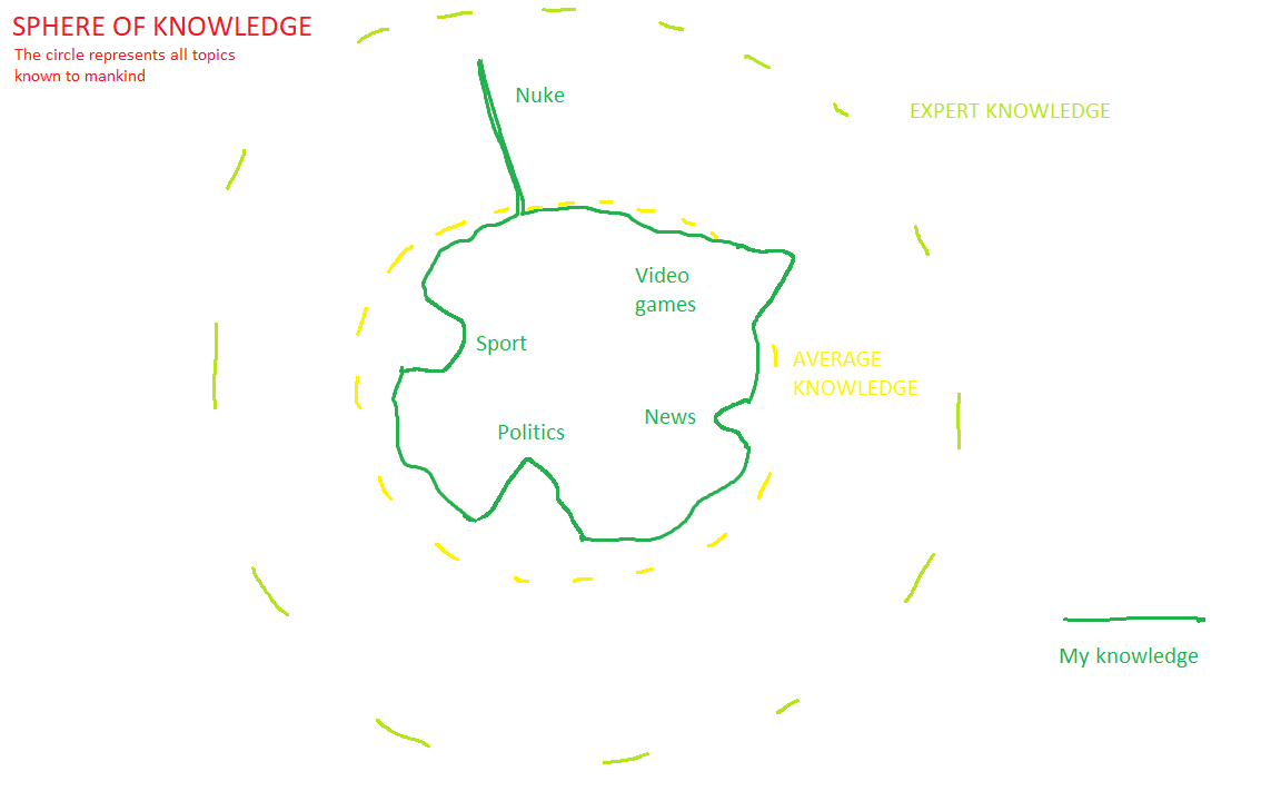 At the outer surface of the sphere we find the most specialised and state-of-the-art knowledge we currently have available. And outside of the sphere lies all yet undiscovered knowledge.